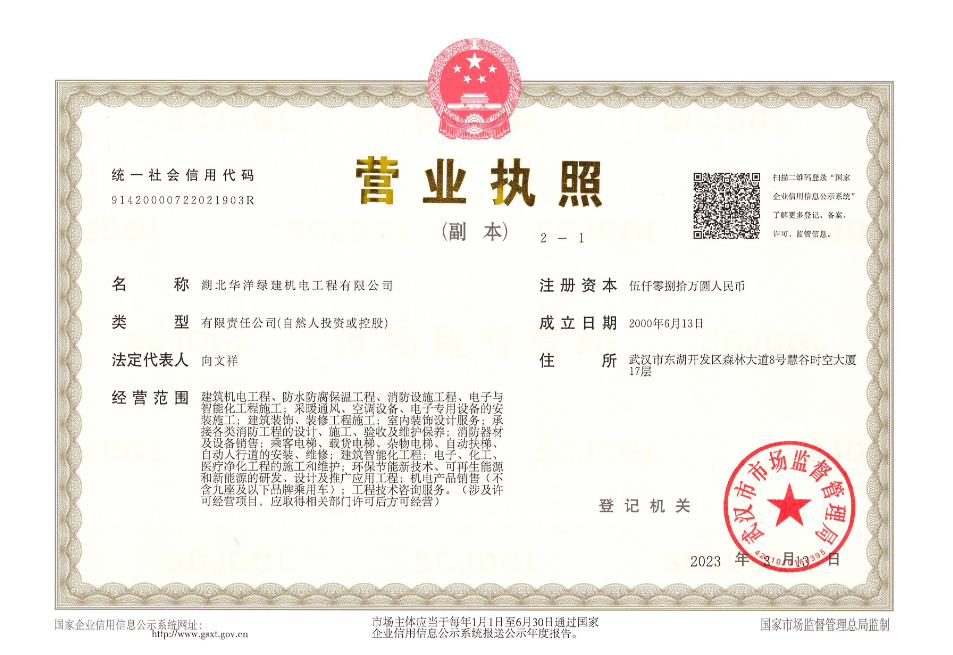 湖北華洋綠建機(jī)電工程有限公司是一家專業(yè)從事機(jī)電工程咨詢、設(shè)計(jì)、施工承包、售后服務(wù)、維修維護(hù)保養(yǎng)的全過(guò)程服務(wù)商,是中央空調(diào)系統(tǒng)節(jié)能咨詢、施工承包、運(yùn)營(yíng)能源管理的專業(yè)服務(wù)商,是電梯工程、潔凈室工程的專業(yè)承包商。公司具有建筑機(jī)電安裝工程專業(yè)承包壹級(jí)資質(zhì)、機(jī)電工程施工總承包叁級(jí)資質(zhì)、中華人民共和國(guó)特種設(shè)備生產(chǎn)許可證電梯安裝(含修理)A2級(jí)資質(zhì)、電子與智能化工程專業(yè)承包貳級(jí)資質(zhì)、消防設(shè)施工程專業(yè)承包貳級(jí)資質(zhì)、防水防腐保溫工程專業(yè)承包貳級(jí)資質(zhì)及建筑裝飾裝修工程專業(yè)承包貳級(jí)資質(zhì)。